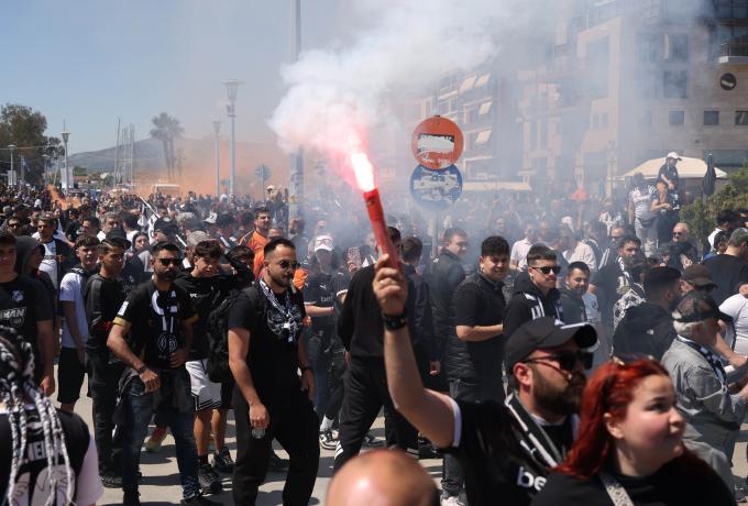 Φίλοι του ΠΑΟΚ και του ΟΦΗ δίνουν «ασπρόμαυρο» τόνο στην παραλία του Βόλου, με συνθήματα και πυρσούς να δημιουργούν «ζεστή» ατμόσφαιρα λίγες ώρες πριν τον τελικό κυπέλλου Ελλάδος Betsson.