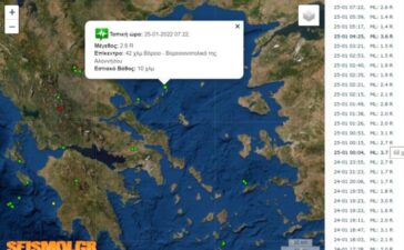 Ασθενής σεισμική δόνηση της τάξης των 2,6 βαθμών της κλίμακας Ρίχτερ σημειώθηκε στις 7.22 σήμερα το πρωί, με επίκεντρο 42 χλμ. Βόρεια – Βορειοανατολικά της...