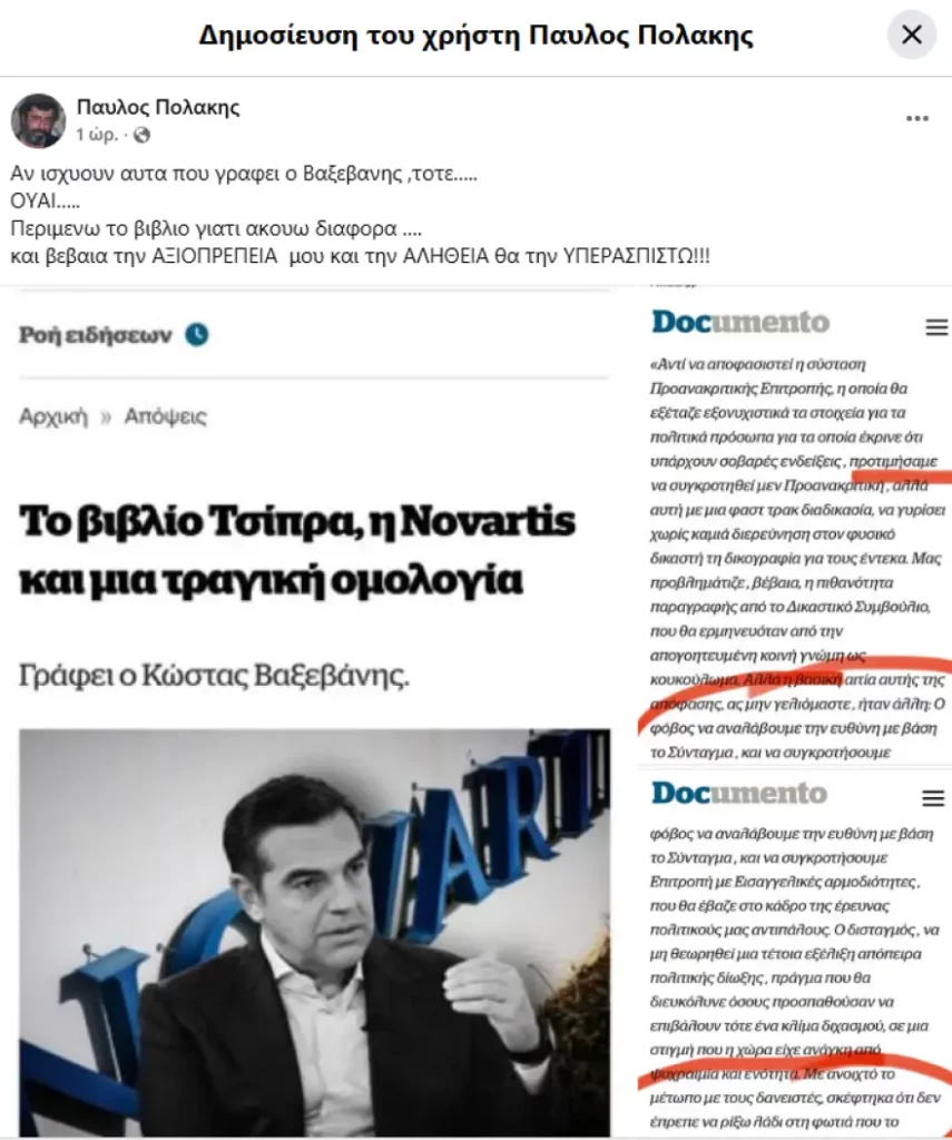 Τα δημοσιεύματα του Documento σε σχέση με το υπό κυκλοφορία βιβλίο του Αλέξη Τσίπρα, πάντως, προκαλούν ήδη την αντίδραση του Παύλου Πολάκη, ο οποίος με ανάρτησή του στο facebook αναφέρει ότι αν ισχύουν αυτά που γράφει ο Βαξεβάνης, τότε , ουαί…. Περιμένω το βιβλίο γιατί ακούω διάφορα …. και βεβαια την ΑΞΙΟΠΡΕΠΕΙΑ μου και την ΑΛΗΘΕΙΑ θα την ΥΠΕΡΑΣΠΙΣΤΩ!!!».