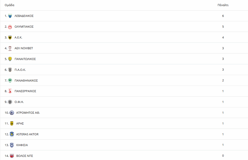Δείτε τη σχετική λίστα με τα κερδισμένα πέναλτι