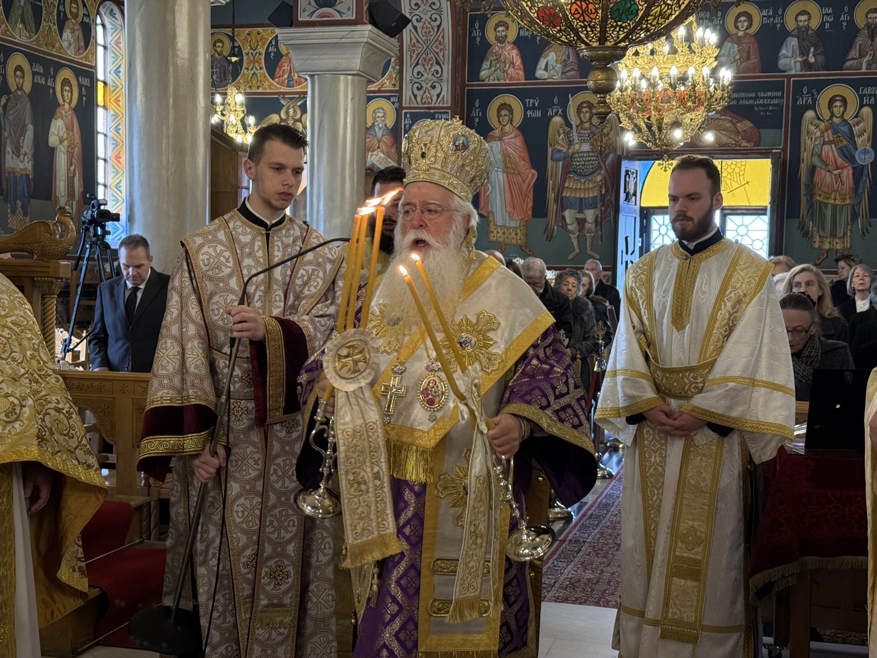 Στο τέλος της Θείας Λειτουργίας, ο κ. Ιγνάτιος ευχήθηκε στον Προϊστάμενο του Ναού, π. Φιλοκτήμονα, με αφορμή την αυριανή ονομαστική του εορτή τονίζοντας ότι: «Τον γνώρισα από τα φοιτητικά του χρόνια, όταν ήρθα στο Βόλο. Εργάζεται κοντά στη Μητρόπολή μας και, όταν ήρθε η ώρα, εισήλθε στον Ιερό Κλήρο. Σήμερα διακονεί με αγάπη και πιστότητα τόσο στην ενορία του Αγίου Γεωργίου όσο και στη Μητρόπολή μας. Του ευχόμαστε υγεία, δύναμη και πολλά χρόνια». Ακολούθως τέλεσε το τεσσαρακονθήμερο μνημόσυνο για την ανάπαυση των ψυχών του Κωνσταντίνου και της Κερασίας, επισημαίνοντας ότι: «Ήρθα σήμερα για να τελέσουμε το μνημόσυνο των αγαπημένων παιδιών μας. Ξέρω ότι δεν μπορώ να προσφέρω πολλά, παρά μόνο την προσευχή και την παρουσία μου στους γονείς, γιατί αυτός ο πόνος είναι πράγματι αβάστακτος. Ας ενώσουμε όμως όλοι τις προσευχές μας για την ανάπαυση των ψυχών τους και για παρηγοριά στις οικογένειές τους».