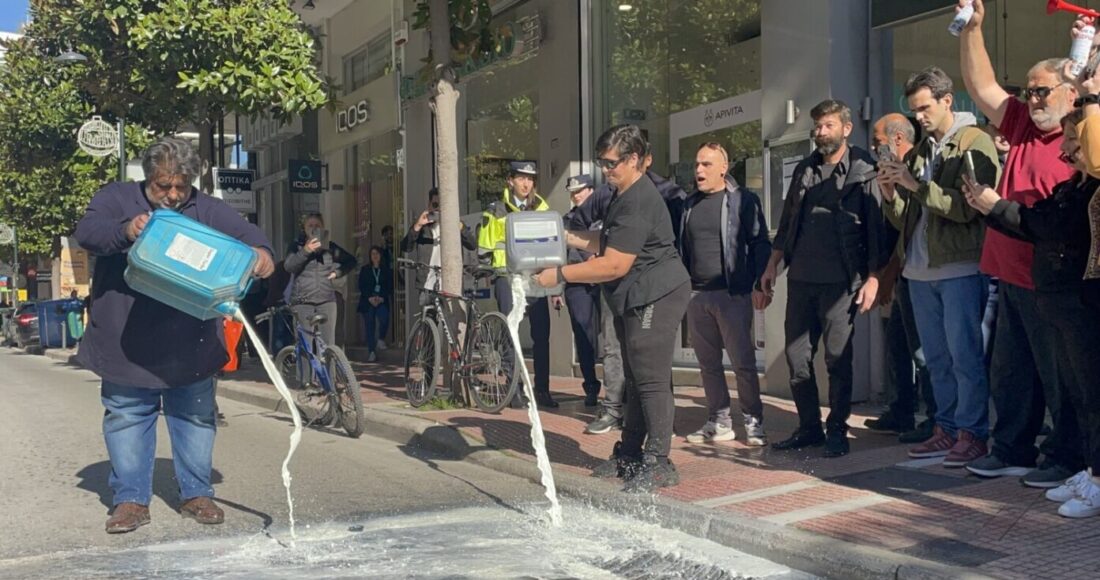 Η διαμαρτυρία συνεχίζεται έως κι αυτή την ώρα, ενώ συμβολικά οι κτηνοτρόφοι έριξαν γάλα κάτω από τα γράφει του γραφείου επί της οδού Παναγούλη.