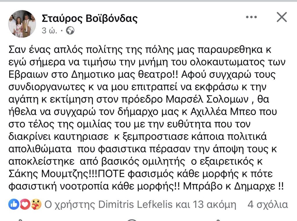 “Σαν ένας απλός πολίτης της πόλης μας παραυρεθηκα κ εγώ σήμερα να τιμήσω την μνήμη του ολοκαυτωματος των Εβραιων στο Δημοτικο μας θεατρο!! Αφού συγχαρώ τους συνδιοργανωτες κ να μου επιτραπεί να εκφράσω κ την αγάπη κ εκτίμηση στον πρόεδρο Μαρσέλ Σολομων , θα ήθελα να συγχαρώ τον δήμαρχο μας κ Αχιλλέα Μπεο που στο τέλος της ομιλίας του με την ευθύτητα που τον διακρίνει καυτηριασε κ ξεμπροστιασε κάποια πολιτικά απολιθώματα που φασιστικα πέρασαν την άποψη τους κ αποκλείστηκε από βασικός ομιλητής ο εξαιρετικός κ Σάκης Μουμτζης!!!ΠΟΤΕ φασισμός κάθε μορφής κ πότε φασιστική νοοτροπία κάθε μορφής!! Μπράβο κ Δημαρχε !!”