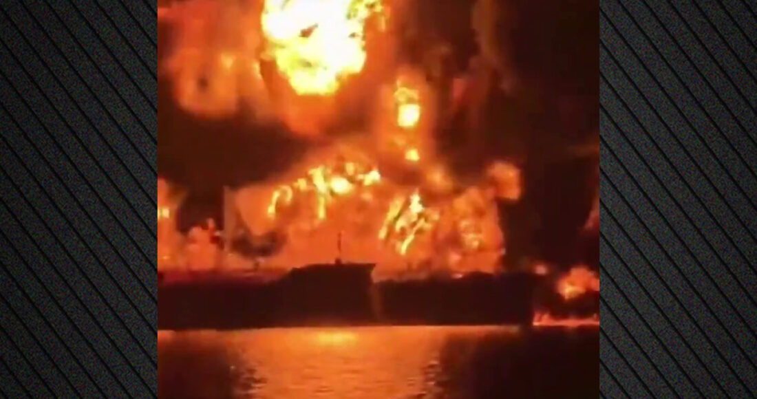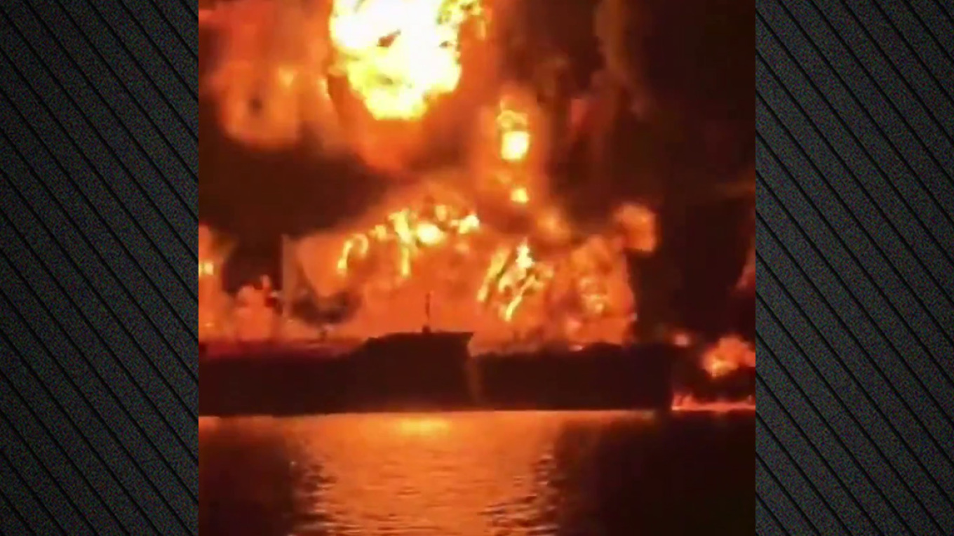 Βίντεο που επαληθεύτηκαν από το αμερικανικό δίκτυο δείχνουν τα πλοία να καίγονται, με τις φλόγες να εξαπλώνονται και στη γύρω θαλάσσια περιοχή, πιθανότατα λόγω διαρροής πετρελαίου.
