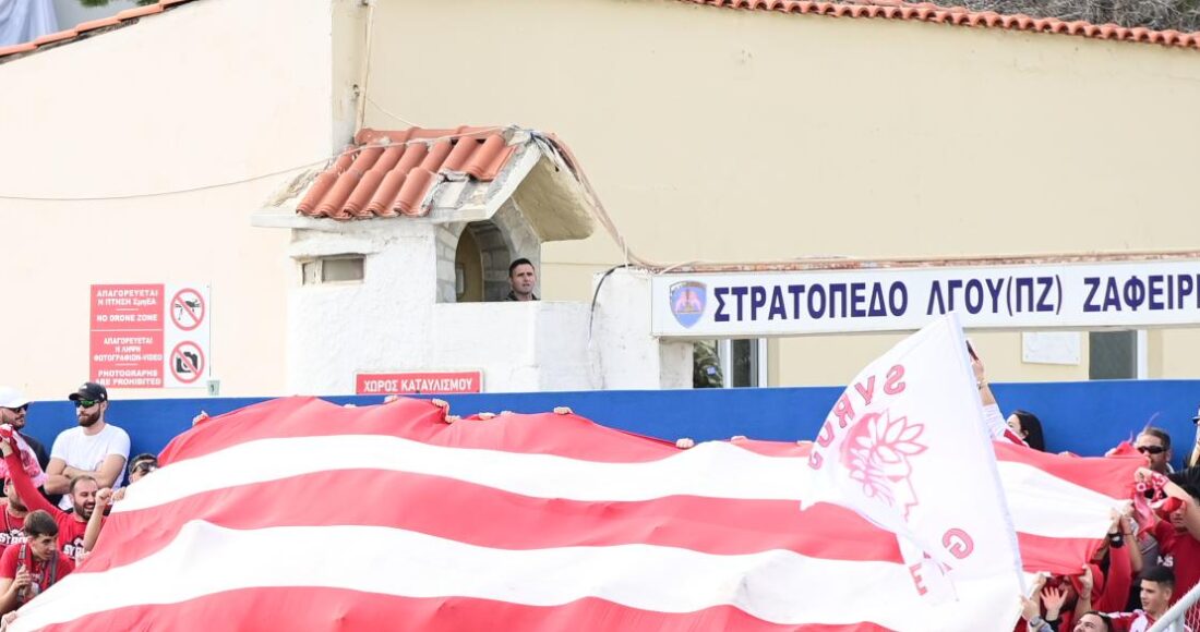 Συγκεκριμένα, πίσω από το σημείο όπου φιλοξενούνται οι οπαδοί των ερυθρολεύκων, δεσπόζει το «Στρατόπεδο Λοχαγού Ζαφείρη Αποστόλου» και η κάμερα έπιασε έναν αλφαμίτη να έχει ανέβει στο πυργίσκο της σκοπιάς και να παρακολουθεί αμέριμνος τα όσα συμβαίνουν εντός γηπέδου.