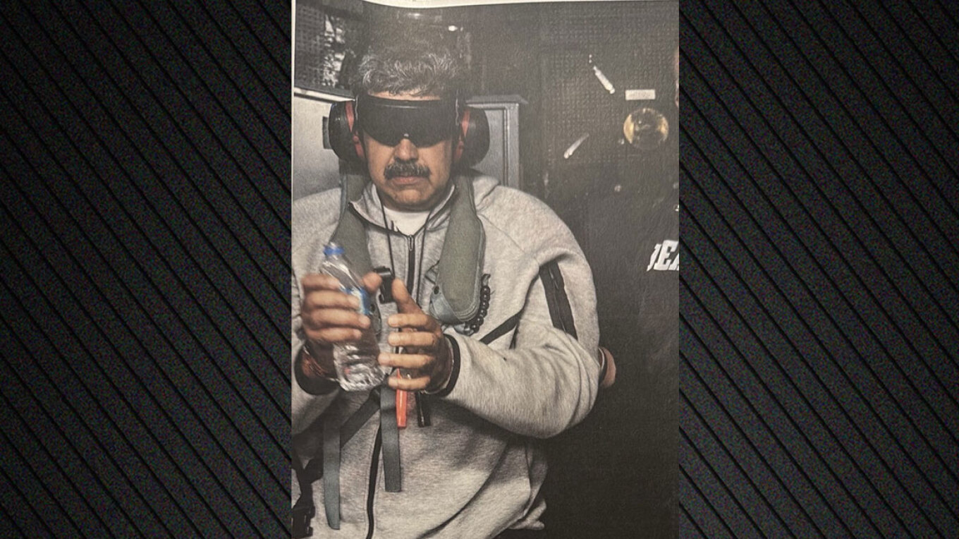 Ο Μαδούρο είναι επάνω στο αμερικανικό αεροπλανοφόρο Iwo Jima, φοράει γκρι φόρμα και έχει τόσο τα μάτια όσο και τα αυτιά του καλυμμένα. Τα χέρια του είναι δεμένα και με δυσκολία κρατάει ένα μπουκάλι νερό.