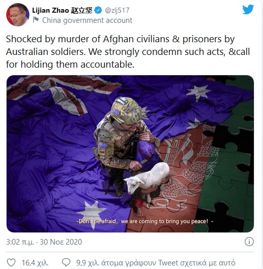Ο Τζάο έγραψε στο Twitter: «Είμαστε συγκλονισμένοι από τον φόνο Αφγανών πολιτών και αιχμαλώτων από Αυστραλούς στρατιώτες. Καταδικάζουμε σθεναρά τις ενέργειες αυτές & ζητούμε να τους αποδοθούν ευθύνες».