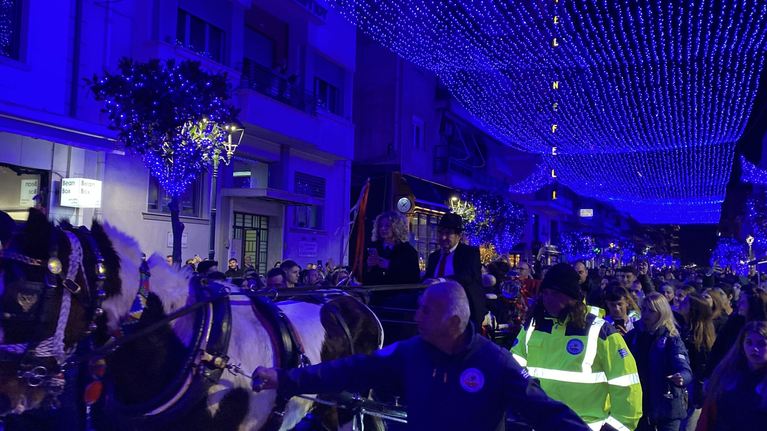 Με την παραδοσιακή εορταστική βόλτα με άμαξες, κάτω από τον μπλε ουρανό στη Δημητριάδος, έκλεισε πριν από λίγη ώρα η φαντασμαγορική τελετή φωταγώγησης του Βόλου.