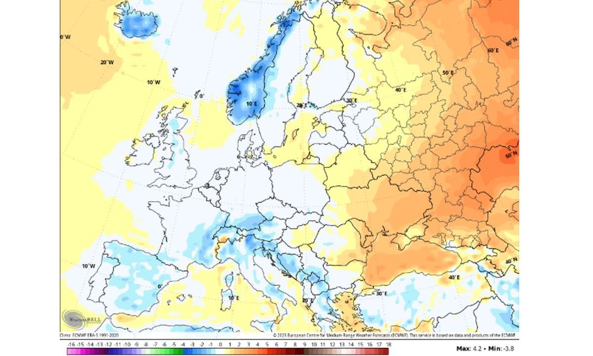 Η Ευρώπη, συνολικά, μετατοπίζεται σε θερμότερη τάση, με αυξημένες πιθανότητες για πιο ήπιο καιρό στα νότια. Για την Ελλάδα, το σενάριο αυτό συνήθως οδηγεί σε περιορισμό των ψυχρών εισβολών και σε έναν Φεβρουάριο με θερμοκρασίες πάνω από τα κανονικά επίπεδα, εκτός αν εμφανιστεί σύντομη αλλά απότομη διαταραχή από τα βορειοανατολικά.