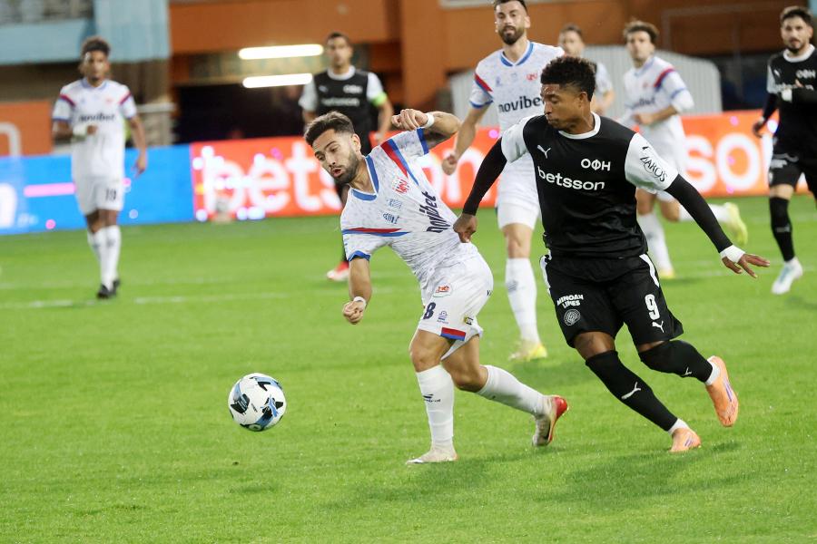Η πρώτη καλή στιγμή στο ματς ανήκε για τους φιλοξενούμενους, με την κεφαλιά του Λάμπρου στο 3ο λεπτό να φεύγει άουτ. Ο ΟΦΗ είχε μεγάλη ευκαιρία για να ανοίξει το σκορ στο 10ο λεπτό του ματς, με τον Ανδρούτσο να μην μπορεί να… νικήσει τον Σιαμπάνη από πλεονεκτική θέση. Ένα λεπτό μετά η νέα κεφαλιά του Λάμπρου πέρασε ελάχιστα άουτ για τους Θεσσαλούς. Στη συνέχεια ο ρυθμός της αναμέτρησης έπεσε αισθητά με τις δύο ομάδες να μην βγαίνουν με αξιώσεις στην επίθεση. Στο 23′ το γυριστό σουτ του Κάργα δεν ανησύχησε την εστία του Λίλο. Δύο λεπτά αργότερα ο Βόλος έφτασε κοντά στο 0-1, αλλά ο Λαμπρόπουλος έδιωξε τη μπάλα από την προσπάθεια του Λάμπρου πριν περάσει την τελική γραμμή.