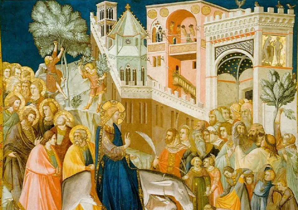 Ερχόμενος ο Ιησούς από τη Βηθανία στα Ιεροσόλυμα, έστειλε δύο από τους Μαθητές του και του έφεραν ένα γαϊδουράκι. Και κάθισε πάνω του για να μπει στην πόλη. Ο δε λαός, ακούγοντας ότι ο Ιησούς έρχεται, πήραν αμέσως στα χέρια τους βάγια από φοίνικες και βγήκαν να τον υποδεχτούν. Και άλλοι μεν με τα ρούχα τους, άλλοι δε κόβοντας κλαδιά από τα δέντρα, έστρωναν το δρόμο απ’ όπου ο Ιησούς θα περνούσε.