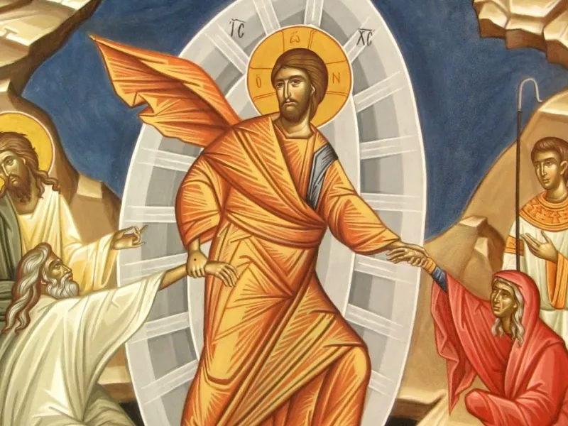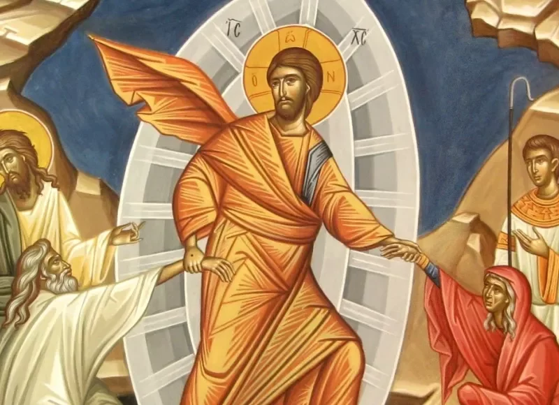 Οι διηγήσεις των Ευαγγελιστών ποικίλλουν. Γνωρίζουμε, όμως, ότι λίγο πριν αρχίσει να χαράζει, αρκετές ώρες δηλαδή μετά την Ανάσταση του Χριστού, κατέβηκε Άγγελος (κατά τον Άγ. Γρηγόριο Παλαμά ο γνώριμος της Θεοτόκου Αρχάγγελος Γαβριήλ) μέσα σε φως και λαμπρότητα και μετακίνησε τον λίθο, που βρισκόταν μπροστά στην πόρτα του μνημείου, λέγοντας στις δύο γυναίκες: «Μη φοβάστε εσείς, γιατί ξέρω ότι ζητάτε τον Ιησού τον σταυρωμένο. Δεν είναι εδώ, αναστήθηκε όπως είπε. Ελάτε να δείτε τον τόπο, όπου ήταν ο Κύριος. Πηγαίνετε γρήγορα και πείτε στους Μαθητές του ότι αναστήθηκε από τους νεκρούς». Σημειωτέτον, ότι μόνο η Παναγία άκουσε τα λόγια του Αγγέλου, ενώ η Μαγδαληνή ουδέν αντελήφθη, παρ’ ότι ήταν μαζί.