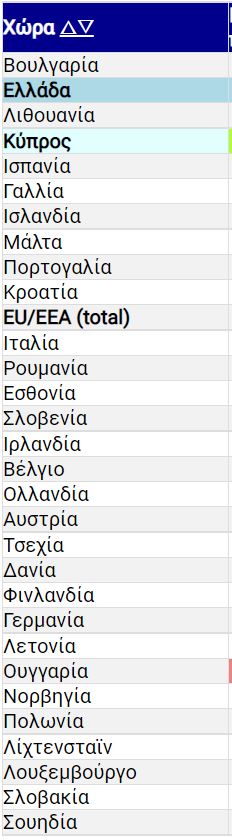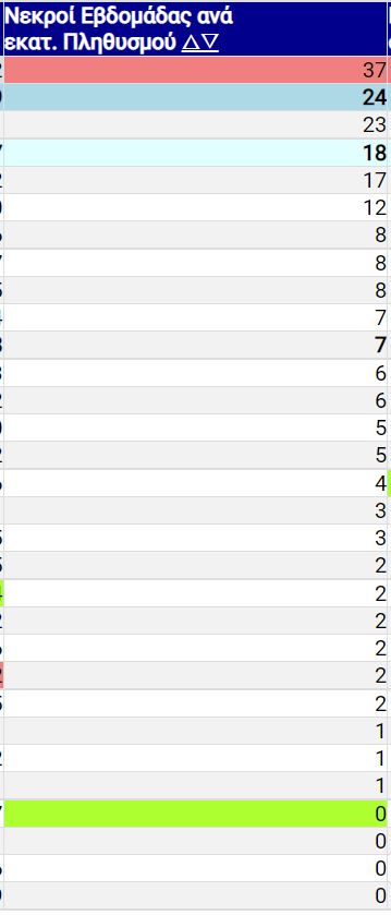 Ο παρακάτω πίνακας προέρχεται από τα στοιχεία του ECDC για την εβδομάδα Δευτέρα 23/8/2021 έως και Κυριακή 29/8/2021 (ISO Week: 2021-W34) και αποτυπώνει την αυξητική πορεία στους θανάτους.