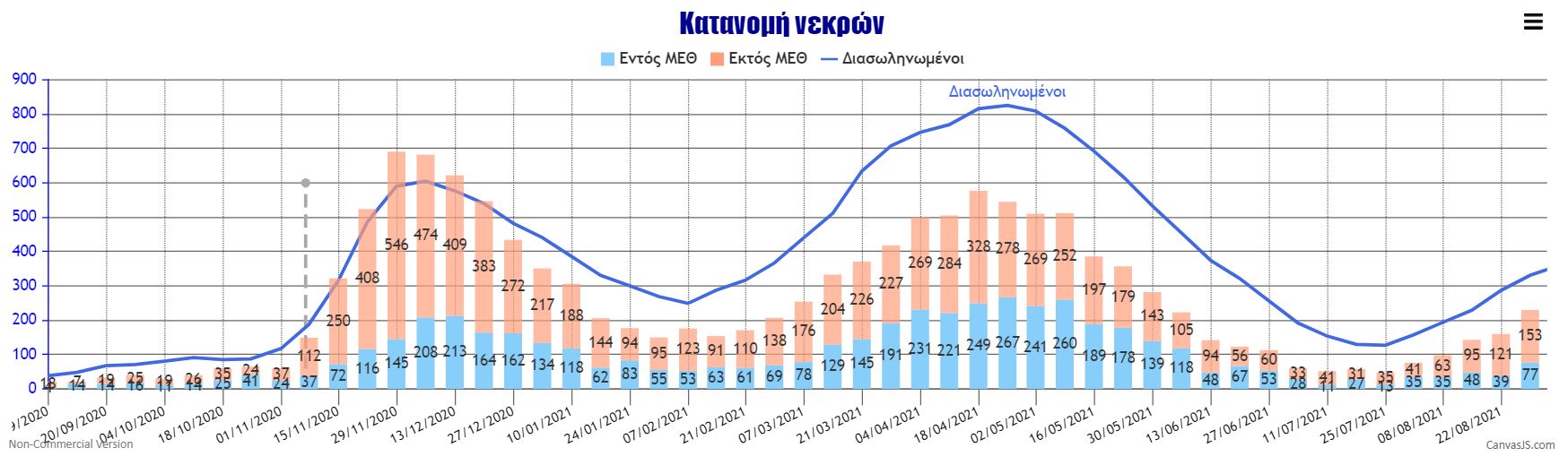 Μεγαλύτερη αύξηση σημειώθηκε, ωστόσο, από τις πρώτες ημέρες του Σεπτέμβρη. Στις 31 Αυγούστου οι θάνατοι ήταν 19, την 1η Σεπτεμβρίου χάθηκαν 47 άνθρωποι, στις 5 Σεπτεμβρίου 43 και χθες Δευτέρα 6 Σεπτεμβρίου και πάλι κατέληξαν 47 ασθενείς.