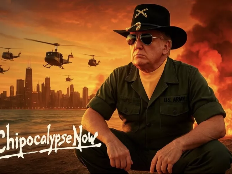 «Το Σικάγο θα καταλάβει γιατί το αποκαλούμε υπουργείο Πολέμου» ανέφερε σε μια ανάρτησή του στην πλατφόρμα Truth Social ο Τραμπ, ο οποίος απειλή εδώ και πολλές ημέρες να στείλει ομοσπονδιακούς στρατιώτες για να «επιτεθούν στην εγκληματικότητα». Η ανάρτηση περιλαμβάνει μια φωτογραφία, δημιούργημα της τεχνητής νοημοσύνης, που δείχνει τον Τραμπ με στρατιωτική στολή, με φόντο πυρκαγιές και ένα ελικόπτερο να πετά στον πορτοκαλί ουρανό του Σικάγο. «Σικαποκάλυψη Τώρα» γράφει η λεζάντα. Πρόκειται για άμεση αναφορά στην ταινία «Αποκάλυψη τώρα» του Φράνσις Φορντ Κόπολα για τον πόλεμο στο Βιετνάμ, με παραποιημένη την πασίγνωστη ατάκα του Ρόμπερτ Ντιβάλ: «Μ’ αρέσει η μυρωδιά των απελάσεων το πρωί».