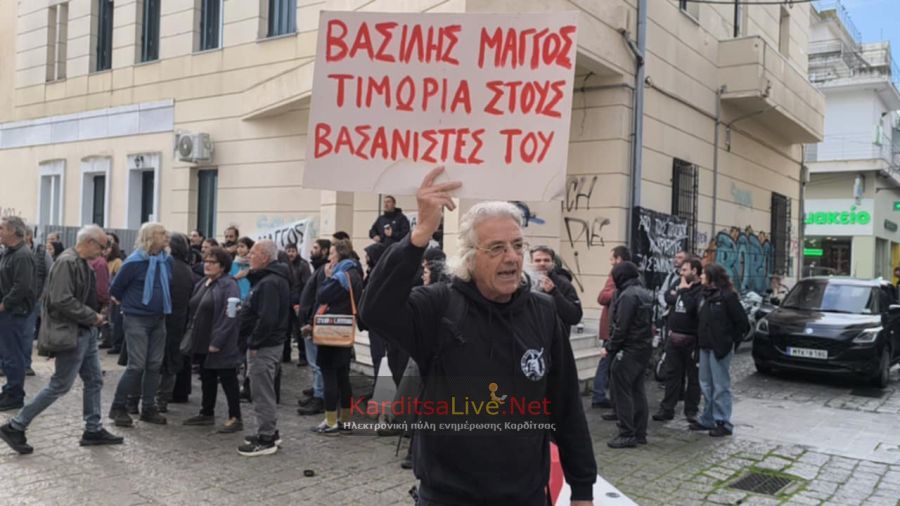 Φωνάζοντας συνθήματα και κρατώντας πλακάτ, που έγραφε «ΒΑΣΙΛΗΣ ΜΑΓΓΟΣ, ΤΙΜΩΡΙΑ ΣΤΟΥΣ ΒΑΣΑΝΙΣΤΕΣ ΤΟΥ» ο κ. Γιάννης Μάγγος, μαζί με αλληλέγγυους που κατέκλυσαν το χώρο έξω από το Δικαστικό Μέγαρο Καρδίτσας από νωρίς το πρωί και ανήρτησαν πανό, διαδήλωσαν για το χαμό του Βασίλη.
