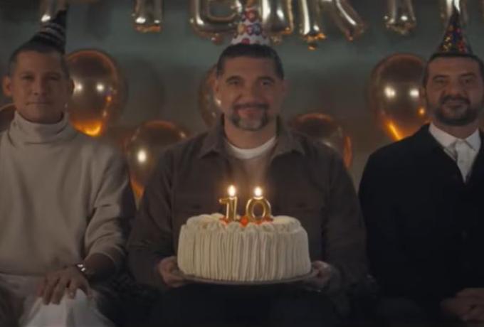 Λεωνίδας Κουτσόπουλος, Πάνος Ιωαννίδης και Σωτήρης Κοντιζάς κρατούν μία τούρτα γενεθλίων με τον αριθμό 10 και εύχονται στο μικρό αγόρι.