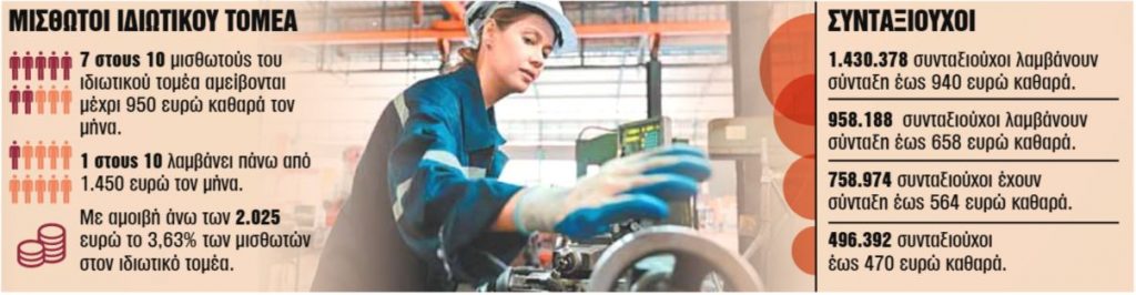 - Πάνω από το 50% των μισθωτών στον ιδιωτικό τομέα αμείβονται με 800 ή λιγότερα ευρώ καθαρά τον μήνα. Δηλαδή οι μισοί μισθωτοί του ιδιωτικού τομέα ζουν σε κατάσταση φτώχειας.
