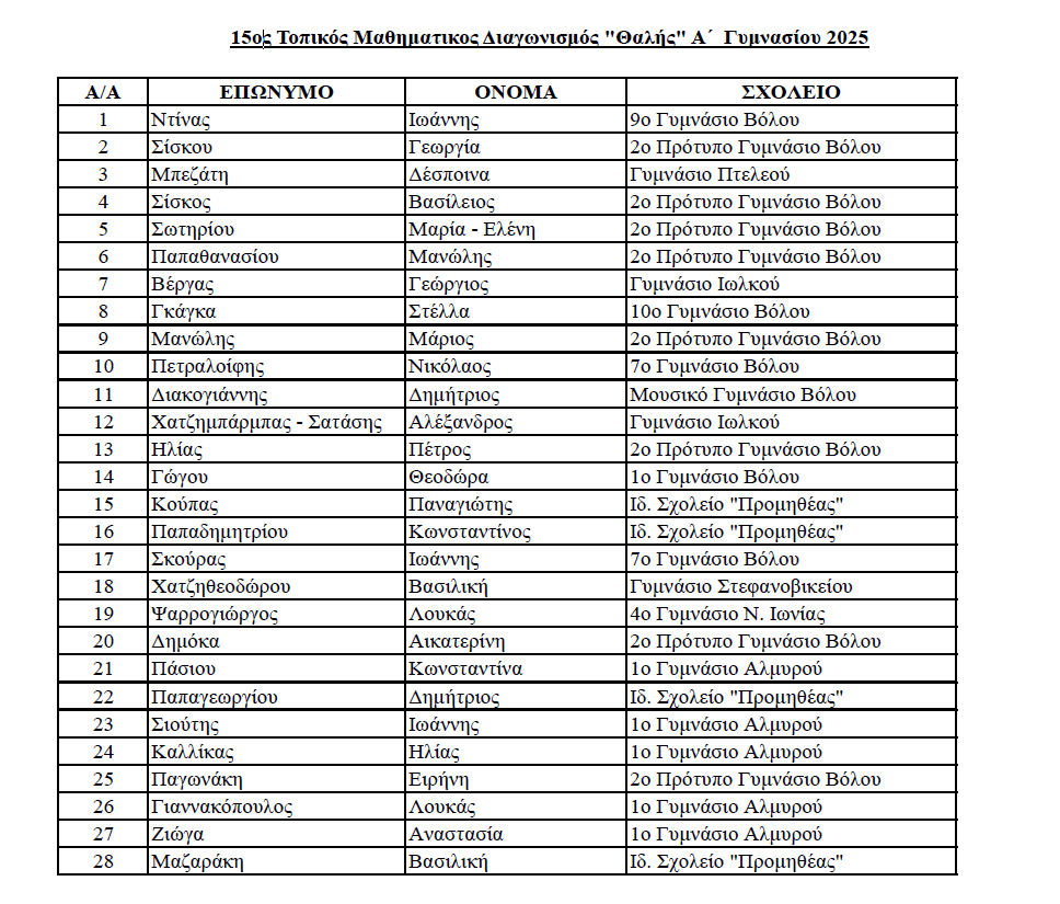 Από την Επιτροπή Διαγωνισμών του Παραρτήματος Ν. Μαγνησίας της Ελληνικής Μαθηματικής Εταιρείας ανακοινώθηκαν τα αποτελέσματα του 15ου Τοπικού Μαθητικού Διαγωνισμού στα Μαθηματικά «Ο Θαλής για την Α ́ Γυμνασίου», που πραγματοποιήθηκε στις 7 Νοεμβρίου 2025 και διοργανώθηκε από το Τοπικό Παράρτημα της Ελληνικής Μαθηματικής Εταιρείας-Παράρτημα Ν. Μαγνησίας.