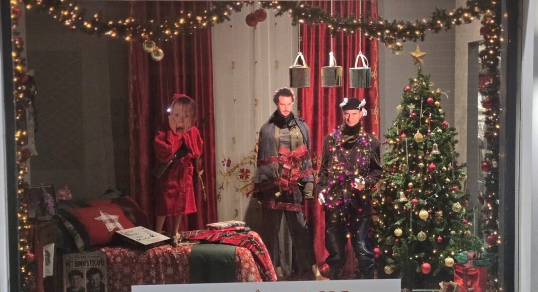Στη συγκεκριμένη πρώτη μας επιλογή, όπως και πέρσι που ήταν στη δεύτερη θέση, το “αφηγηματικό/μυθιστορηματικό” ύφος της κεντρικής βιτρίνας της ΟΙΚΟΕΝΔΥΣΗΣ προκύπτει πολύ ενδιαφέρον, ειδικότερα με τη συγκεκριμένη πηγή έμπνευσης που ήταν η γνωστή ταινία “Μόνος στο σπίτι”. Το σκηνογραφικό στήσιμο, τα ετερόκλητα υλικά, το χιούμορ, το παράξενο και η ζεστασιά, όπως ακριβώς και στην ταινία, μεταφέρονται στη βιτρίνα με τη συγκεκριμένη πρόταση που απαίτησε βέβαια και πολλή δουλειά στην προετοιμασία της! Επιπλέον οι χρωματική αρμονία του συνόλου και η εν γένει σύνθεση δηλώνουν τη διάθεση για κάτι επεξεργασμένο και διαφορετικό.