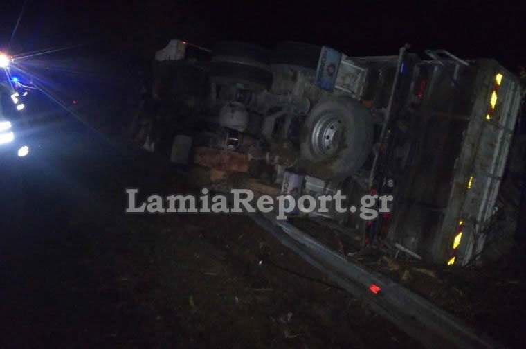 Το βαρύ όχημα βρέθηκε εκτός δρόμου τουμπαρισμένο στο πρανές, ευτυχώς χωρίς να τραυματιστεί ο οδηγός, ο οποίος είχε ξεκινήσει από το Βόλο με προορισμό την Αθήνα.