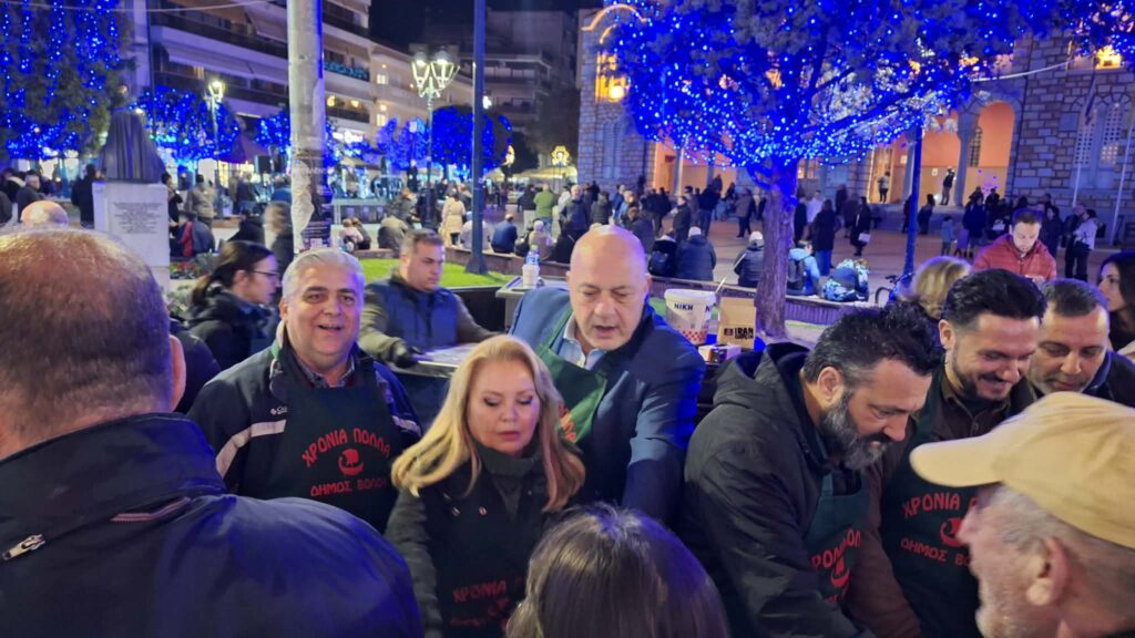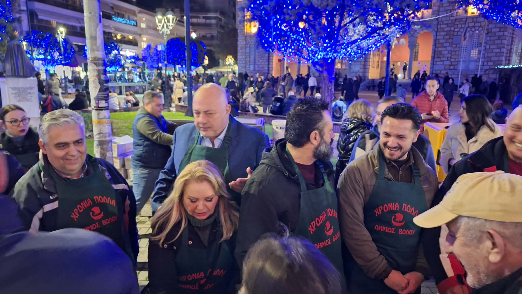 Γιορτινό τραπέζι αγάπης έστρωσε και φέτος, προπαραμονή των Χριστουγέννων, στον πεζόδρομο της Ερμού, μπροστά από τον Αγιο Νικόλαο, ο Δήμος Βόλου. Η πλατεία είναι ασφυκτικά γεμάτη από μικρούς και μεγάλους που έσπευσαν να συμμετέχουν. Οι εθελοντές της Λέσχης Ειδικών Δυνάμεων έχουν δημιουργήσει μία ανθρώπινη αλυσίδα, ώστε με τάξη όλοι να προσέρχονται για να πάρουν τα εδέσματα που η δημοτική αρχή του Αχιλλέα Μπέου ετοίμασε για εκείνους. Ο ίδιος ο δήμαρχος, όλοι οι αντιδήμαρχοι και συνεργάτες της δημοτικής αρχής φόρεσαν τις Χριστουγεννιάτικες ποδιές τους και εξυπηρετούν τον κόσμο που προσέρχεται, ενώ το γνωστό συγκρότημα «Διπλοπενιές» διασκεδάζει τον κόσμο.