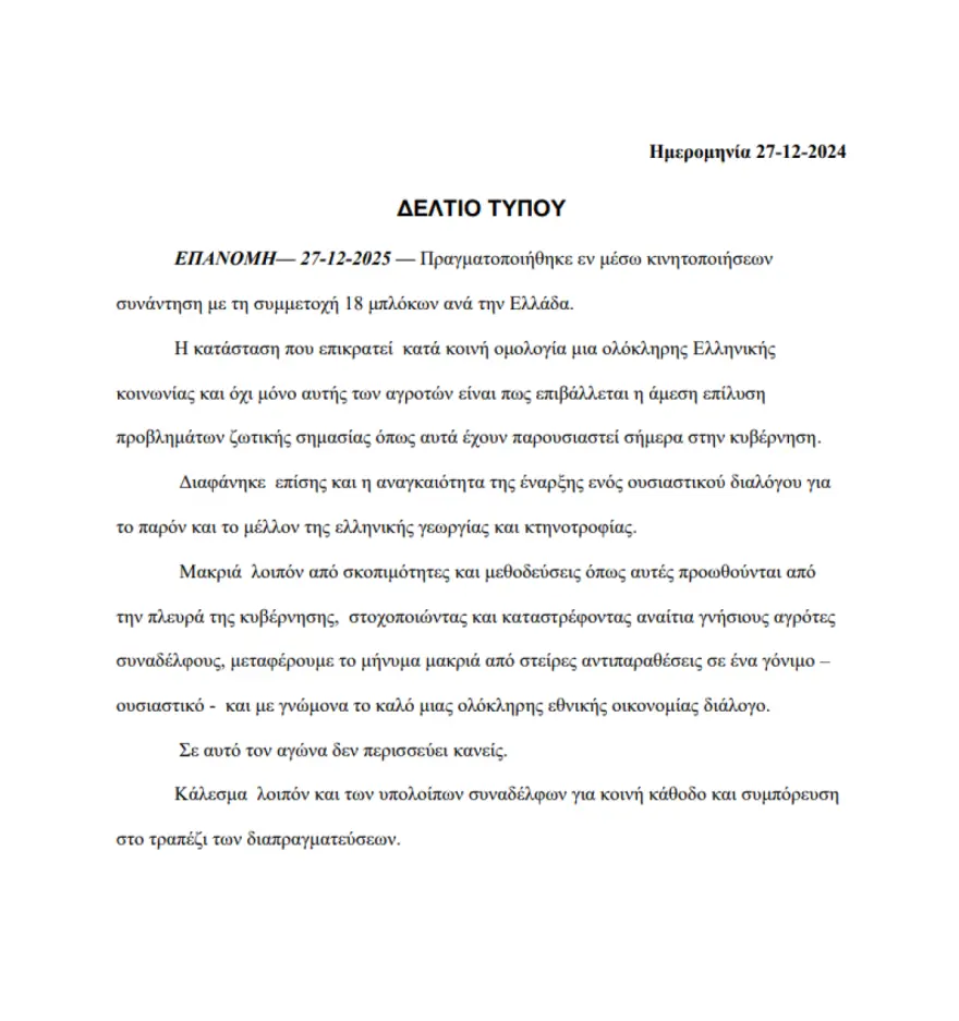 Στην ίδια ανακοίνωση γινόταν λόγος για στοχοποίηση και «αναίτια καταστροφή γνήσιων αγροτών συναδέλφων», ενώ διατυπώθηκε η θέση ότι ο διάλογος πρέπει να διεξαχθεί μακριά από στείρες αντιπαραθέσεις και με μοναδικό γνώμονα το συμφέρον της εθνικής οικονομίας. «Σε αυτόν τον αγώνα δεν περισσεύει κανείς» ανέφεραν χαρακτηριστικά, απευθύνοντας κάλεσμα και προς τους υπόλοιπους αγρότες για κοινή κάθοδο και συμπόρευση στο τραπέζι των διαπραγματεύσεων.