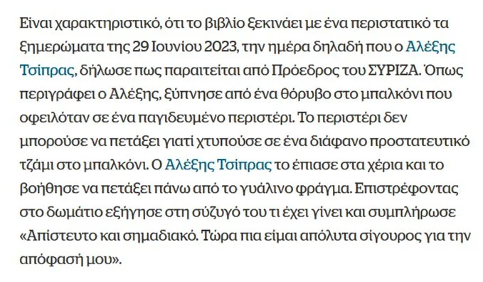 Υπάρχει επίσης η περιγραφή ενός περιστατικού που κάνει ρεζίλι τον πρώην πρωθυπουργό. Εκτυλίσσεται τα ξημερώματα της 29 Ιουνίου 2023, την ημέρα δηλαδή που ο Τσίπρας δήλωσε πως παραιτείται από Πρόεδρος του ΣΥΡΙΖΑ.
