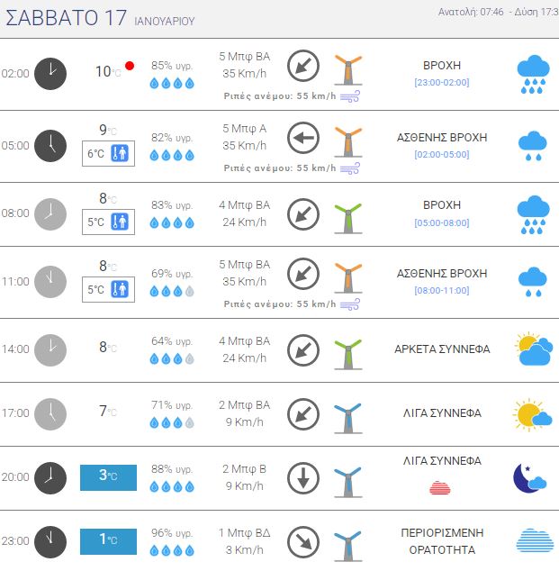Στον Βόλο, το Σάββατο ξεκινά με βροχή τις πρωινές ώρες, με τη θερμοκρασία να κυμαίνεται στους 7–8 βαθμούς Κελσίου. Από το μεσημέρι και μετά τα φαινόμενα εξασθενούν, με ασθενείς βροχές και στη συνέχεια αρκετά έως λίγα σύννεφα. Το βράδυ ο καιρός βελτιώνεται, ωστόσο η υγρασία παραμένει υψηλή και η θερμοκρασία υποχωρεί στους 3–1 βαθμούς. Οι άνεμοι πνέουν βορειοανατολικοί, έως 5 μποφόρ τις πρωινές ώρες, με ριπές που τοπικά αγγίζουν τα 55 km/h.