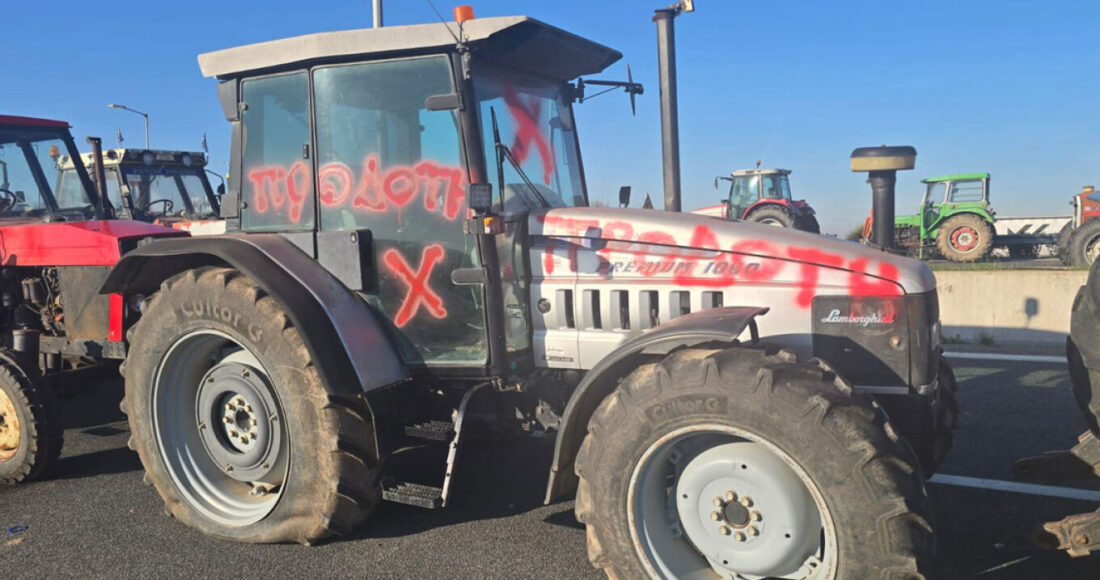 Όπως φαίνεται στις φωτογραφίες του protothema.gr, οι δράστες έγραψαν με μπλε και κόκκινη μπογιά τη λέξη «προδότης» ενώ έσκασαν και τα λάστιχα των τρακτέρ.