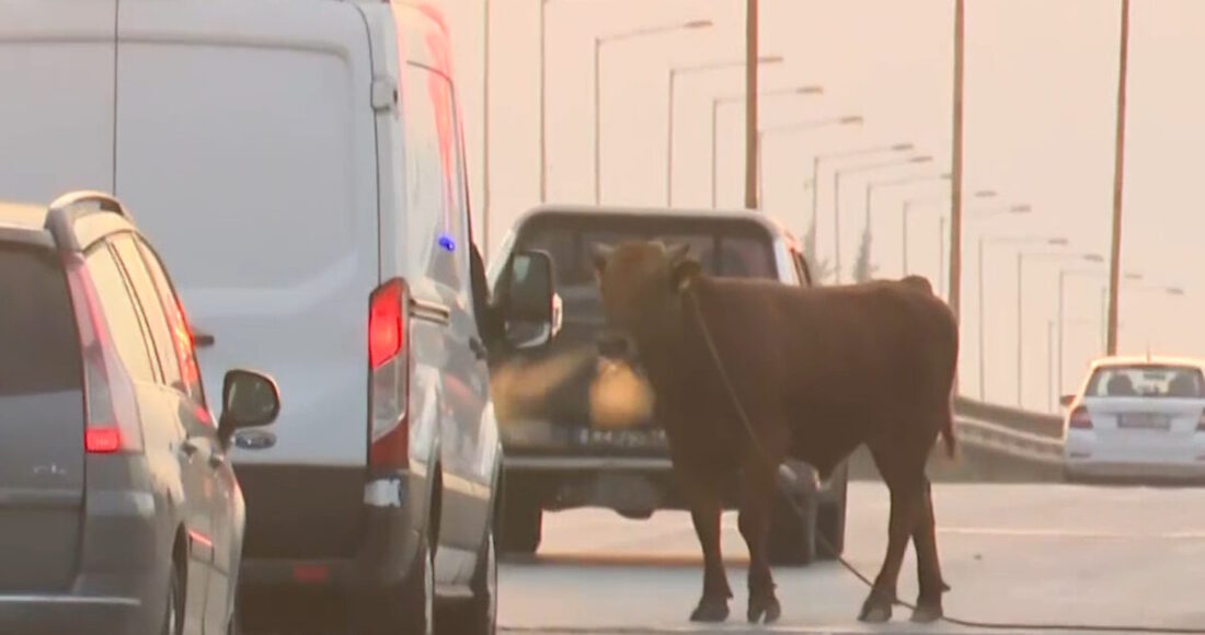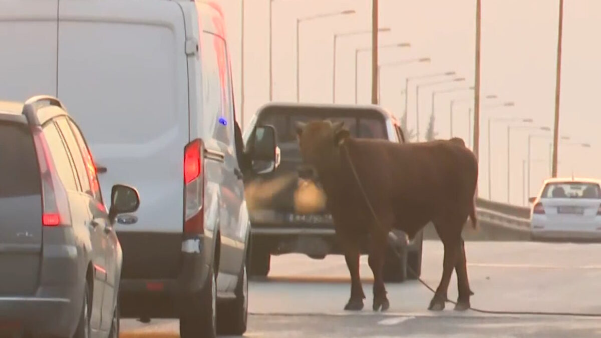 Η αγελάδα που πιάστηκε on camera να περπατά τρομαγμένη ανάμεσα στα αυτοκίνητα στην εθνική οδό της Θεσσαλονίκης παρέμεινε στο σημείο για περίπου 45 λεπτά