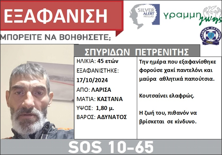 Στο Silver ALert αναφέρονται τα εξής: «Ο Σπυρίδων Πετρενίτης, 45 ετών, εξαφανίστηκε στη Λάρισα, το μεσημέρι της 17/10/2024. Ο αναζητούμενος, έφυγε στις 17 Οκτωβρίου 2024 από τον Τύρναβο Λάρισας με λεωφορείο των ΚΤΕΛ με κατεύθυνση τη Λάρισα. Στις 12:00μ. αποβιβάστηκε από το λεωφορείο στη Λάρισα και έκτοτε αγνοείται.