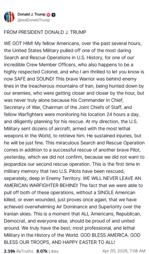 «ΤΟΝ ΕΧΟΥΜΕ! Αγαπητοί μου Αμερικανοί, τις τελευταίες ώρες οι Ένοπλες Δυνάμεις των ΗΠΑ πραγματοποίησαν μία από τις πιο τολμηρές επιχειρήσεις έρευνας και διάσωσης στην ιστορία των ΗΠΑ, για έναν από τους εξαιρετικούς μας αξιωματικούς πληρώματος, ο οποίος είναι επίσης ένας ιδιαίτερα σεβαστός Συνταγματάρχης, και με χαρά σας ενημερώνω ότι είναι πλέον ΑΣΦΑΛΗΣ ΚΑΙ ΥΓΙΗΣ!» έγραψε ο Τραμπ σε ανάρτησή του.