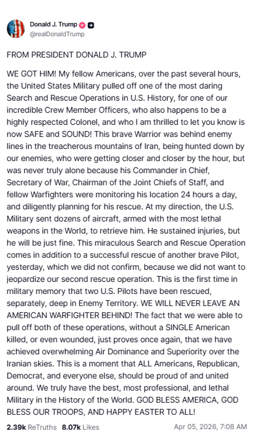 «ΤΟΝ ΕΧΟΥΜΕ! Αγαπητοί μου Αμερικανοί, τις τελευταίες ώρες οι Ένοπλες Δυνάμεις των ΗΠΑ πραγματοποίησαν μία από τις πιο τολμηρές επιχειρήσεις έρευνας και διάσωσης στην ιστορία των ΗΠΑ, για έναν από τους εξαιρετικούς μας αξιωματικούς πληρώματος, ο οποίος είναι επίσης ένας ιδιαίτερα σεβαστός Συνταγματάρχης, και με χαρά σας ενημερώνω ότι είναι πλέον ΑΣΦΑΛΗΣ ΚΑΙ ΥΓΙΗΣ!» έγραψε ο Τραμπ σε ανάρτησή του.