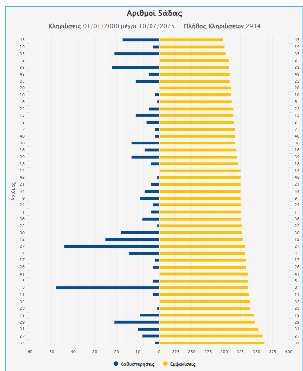 Από την άλλη πλευρά οι 10 αριθμοί της πεντάδας που έχουν καθυστερήσει να κληρωθούν τις περισσότερες φορές είναι: