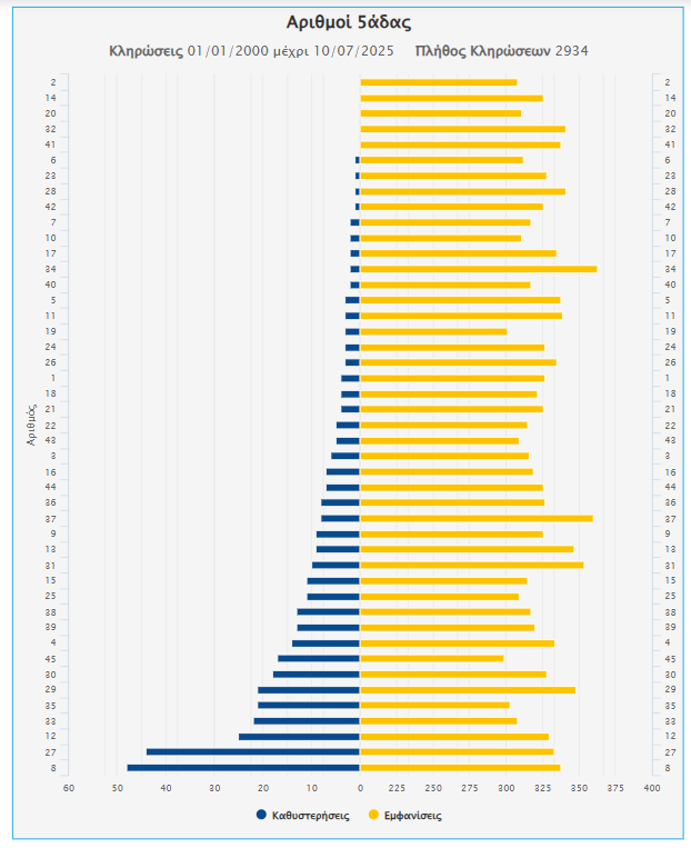 Ο ΟΠΑΠ έχει δημοσιεύσει τη λίστα με τα πιο συχνά και τα πιο σπάνια νούμερα (στατιστικά κληρώσεων) τόσο για τους αριθμούς της πεντάδας, όσο και για τον αριθμό Τζόκερ.