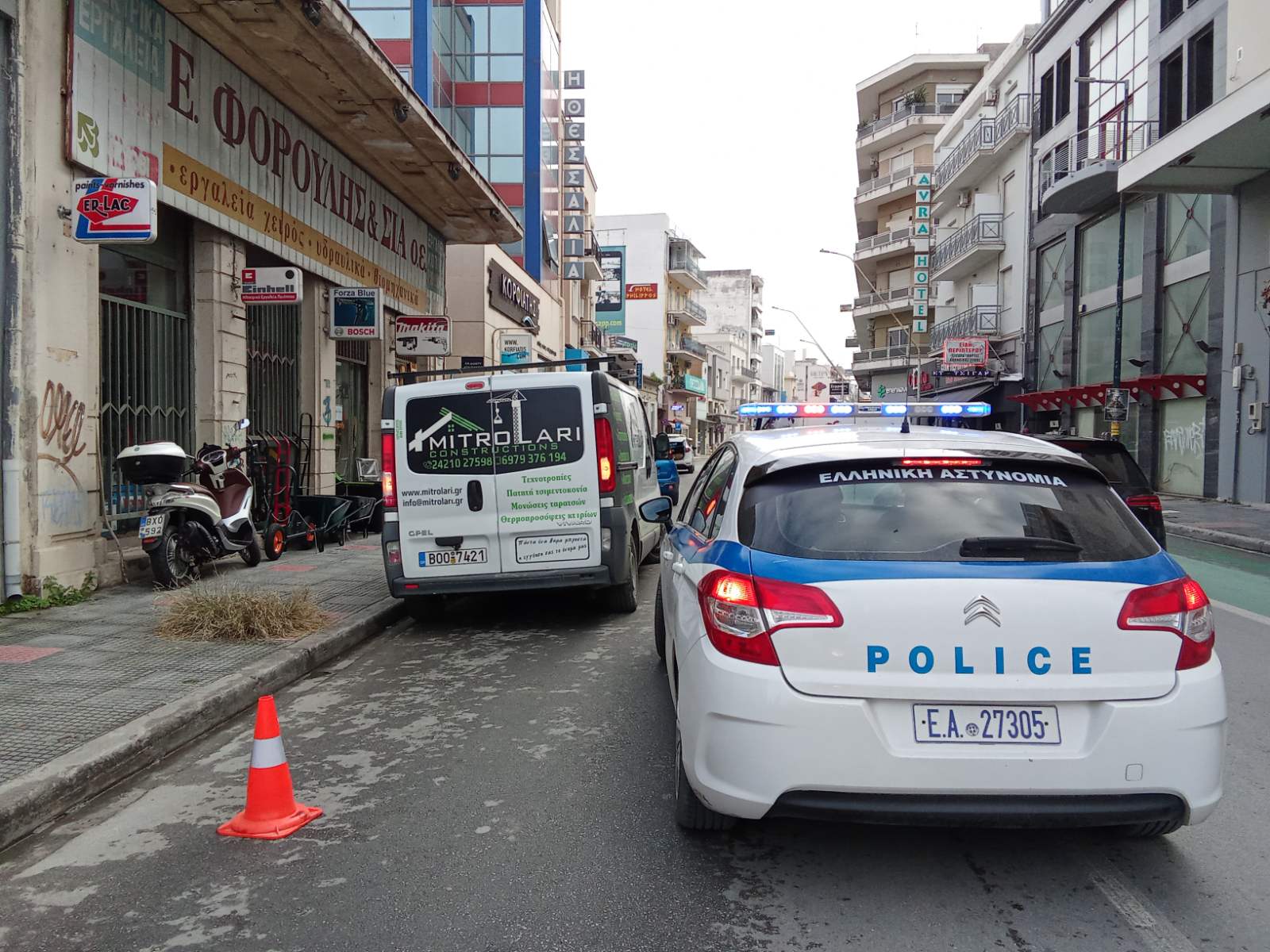 Από προχθές βγήκε έξω και ο γερανός του Τμήματος Τροχαίας Βόλου ο οποίος θα παραμείνει στο κέντρο για την αποτροπή της παράνομης στάθμευσης και σήμερα.