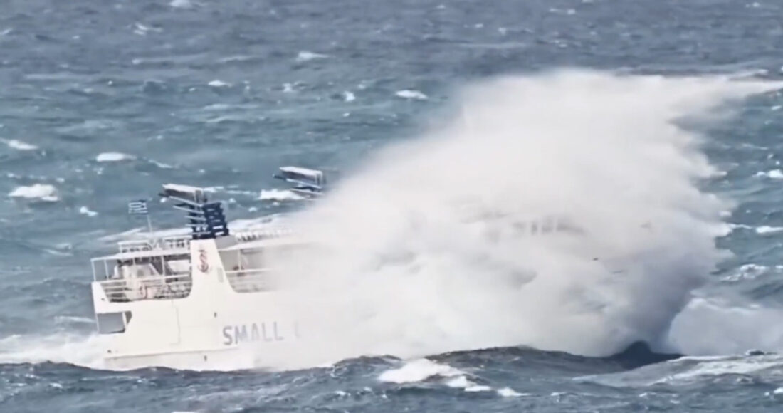 Εντυπωσιακές είναι οι εικόνες που κατέγραψε η κάμερα και δείχνουν τον «Σκοπελίτη» να πλέει εν μέσω θαλασσοταραχής.