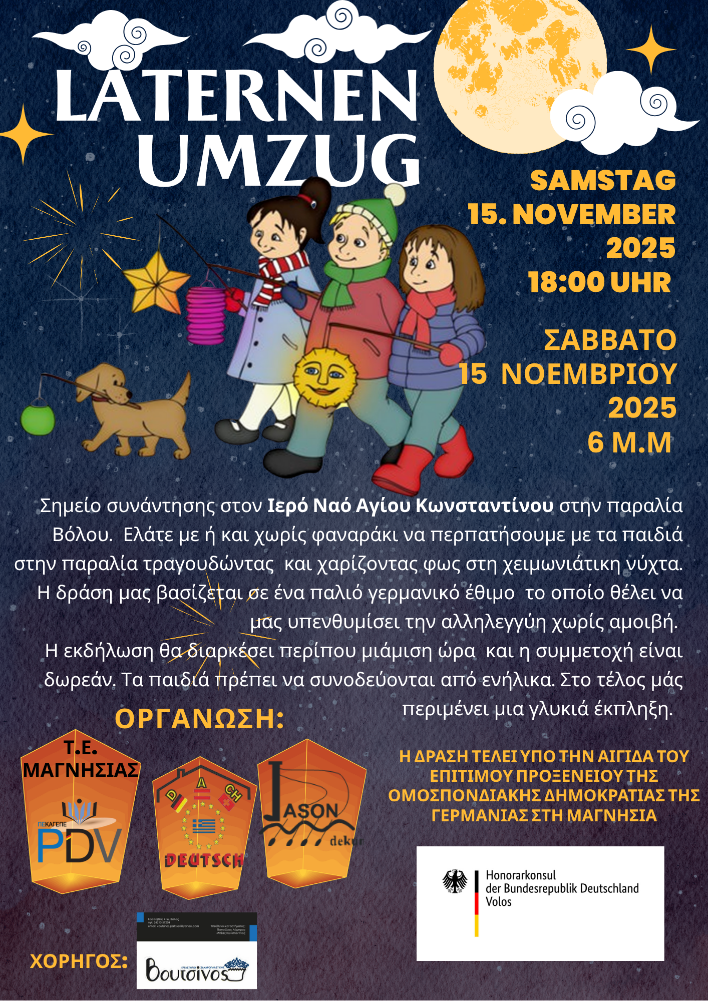 Η Τοπική Επιτροπή της Πανελλήνιας Ένωσης Καθηγητών Γερμανικής Γλώσσας Πανεπιστημιακής Εκπαίδευσης ( ΠΕ.ΚΑ.ΓΕ.ΠΕ) , ο Σύλλογος Γερμανόφωνων Μαγνησίας Ιάσων και το Φροντιστήριο Γερμανικής Γλώσσας DACH- Volos προσκαλούν σε δράση – βόλτα με φαναράκια στην Παραλία του Βόλου, το Σάββατο 15 Νοεμβρίου στις 18:00. (Διάρκεια εκδήλωσης περίπου μιάμιση ώρα)